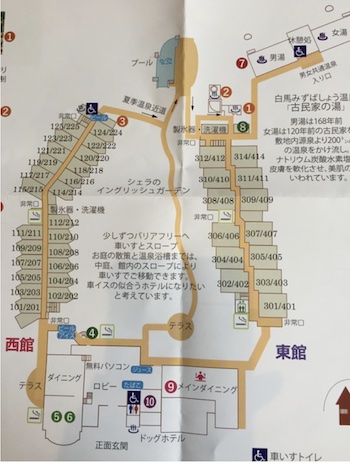 ○庭の散策と温泉浴槽までは、中庭・館内のスロープにより、高齢者、身体が不自由な方にも安心してお過ごしていただけるバリアフリー対応です。