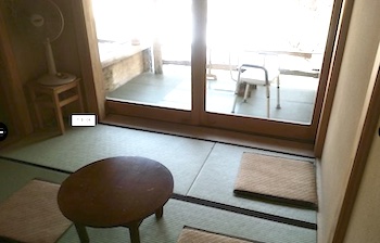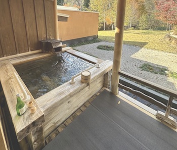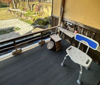 ○貸切風呂「千利休」は、バリアフリーになっており、車椅子で浴室まで入ることができ、洗い場にはシャワーチェアがあり、木製の浴槽の広い縁には手すりもあります。