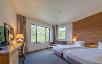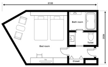 ○バリアフリールーム:宿泊棟は東館と西館に分かれております。36㎡ユニバーサルツインルームは西館にあり、定員1~3名、2台(+エキストラベッド1台:110×200cm(エキストラベッド:90×190cm))のバリアフリー対応です。全室1階にある車椅子のお客様でもご利用しやすいユニバーサルルームです。室内の段差がなく、バスルームの扉も広く、車椅子での乗り入れができます。浴槽周りには広めの縁と手すりがありますが、シャワーチェアのタイプや貸出は確認できません。