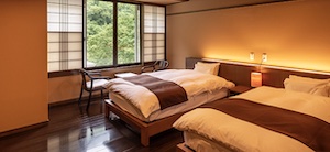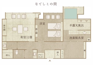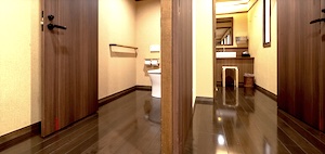 ○障害者対応客室:「なでしこの間(定員2〜6名)」はバリアフリー対応、洋室と和室の二間、半露天風呂(温泉ではありません)付きのお部屋です。和室12畳+洋室(ツインベッドルーム)。入口はスロープ、室内はフルフラット、風呂とトイレは手すり。室内のお風呂は、洗い場にシャワーチェアがあり、浴槽に二つの手すりと腰掛けスペースと踏み台があり、少し歩行ができる方であれば介助者の手助けで安全に湯船に浸かれます。大浴場へもご移動がしやすい低層階。