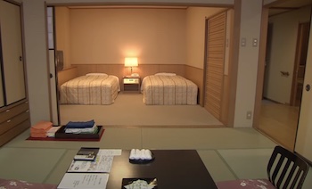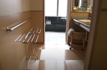 ○バリアフリールーム:使いやすさと安全性を重視したバリアフリー設計の客室です。お身体の不自由な方にも安心してお使いいただけます。入口の上り框の段差はスロープで解消。間取りは和室+洋室(2シングルベッド)+浴室(洗面所付き)+トイレで、段差がありません。浴室は洗い場付き、浴槽脇に広い腰掛けスペース・手摺があり、トイレも両側に手摺があります。