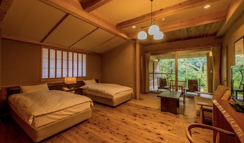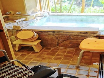 ○バリアフリールーム:すべての方にやさしいバリアフリー(ユニバーサル)仕様の1階にある107号室源泉掛け流し100%露天風呂付洋室(フローリング15帖)。広さ30㎡/定員2名。部屋の洗面・トイレも広く段差がない為、車椅子でもご利用いただけます。ベッド幅110cm×長さ200cm×高さ45cm 2台。洋室内浴室は車椅子で洗い場や浴槽に近づけ、シャワーチェアの無料貸出しがあり、浴槽脇には腰掛けスペースと手摺があり。