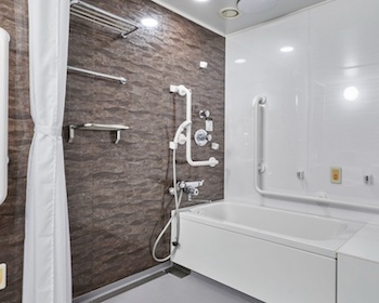 3点ユニットバスには浴槽脇腰掛けスペース・手摺あり。