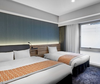○障害者対応客室:26㎡ユニバーサルツインルームあり、定員:2人、154cm×195cm(1台)90cm×195cm(1台)、車椅子でのご利用も可能なバスルームやトイレを完備。お部屋も広めの作りとなっております。ツインルーム入口ドア:引き戸。3点ユニットバスには浴槽脇腰掛けスペース・手摺あり