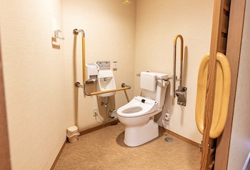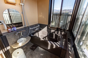 ◯貸切露天風呂は、広々とした空間を誇るお風呂です。趣の違う2種類の貸切露天風呂「円座の湯」「方丈の湯」があり、浴槽脇に手摺と腰掛けスペースがありますが、浴室内の移動や洗い場のバリアフリーの入浴補助具はありません。