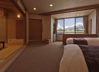 ○玄関からお手洗い・ベッドルーム・洗面台までがフラットな間と、小あがりの和室のあるユニバーサルタイプの客室です。ベッドルームの窓からは富士山を望むことができます。