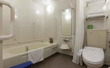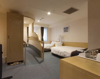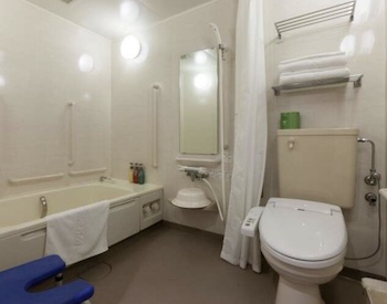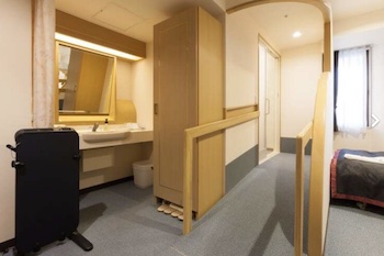 ○障害者対応客室:22㎡・定員2名のユニバーサルツイン1室、バスルーム入口前にスロープがあり、浴室内にはアームサポートや背もたれなしシャワーチェア、手すり・腰掛けスペースがあり。トイレに手摺あり、洗面台の下部には車椅子の車体挿入スペースがあり。ベッドとベッドの間隔は車椅子が入れる。