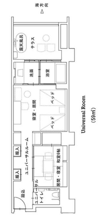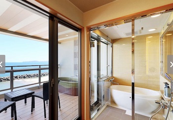◯障害者対応客室:広さは59㎡・定員2〜4名の温泉露天風呂付客室ユニバーサル和洋室があります。間取りはオーシャンビュー/テラス温泉露天風呂付/内バス/和洋室/ツイン/和室6帖です。シモンズベッド2台(セミダブル幅120cm×長さ200cm×高さ46cm)。段差がなく、快適にお過ごしいただけるお部屋です。難点が2つあります。一つ目は手摺がほとんどないこと、二つ目は広い腰掛けスペース無く、シャワーチェアの確認はできませんが、テラス温泉露天風呂エリアにある椅子を上手く使えば(ただし、高さの確認が必要です)、腰掛けスペースやシャワーチェアとなると考えておすすめしています。