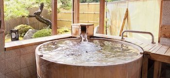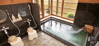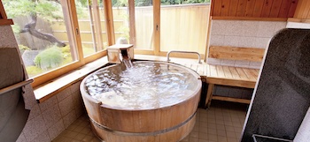 ○貸切風呂は「ほの香(桶風呂)」:丸い檜風呂には移乗台と手摺があり。