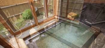 ○貸切風呂は「ゆの香(石風呂)」:四角の石風呂の高さはほぼ床の高さで、洗い場から手摺があり、浴槽内は2段になって居ます。