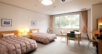 ○障害者対応客室:16畳/定員3名ツイン1室。洋室はバリアフリータイプの部屋として利用いただけます。車椅子でも自由に移動できる広い客室です。畳の間にお布団を敷いて、3名利用も可能です。 浴室・トイレは車椅子対応となっており、介助が必要な方の利用が可能です。