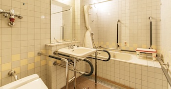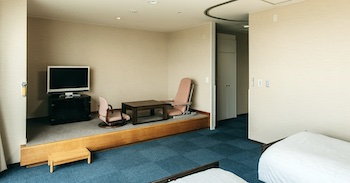 ○障害者対応客室:34㎡バリアフリー対応客室(バス・トイレ付き・2階)で利用人数3名です。安心して過ごせるバリアフリーのお部屋。すべてのお客様に快適にお過ごしいただけます。座椅子(高さ調整可能)、グリップ肘付椅子、万能テーブル、滑り止めマット、ステップ台、バスシート、段差解消踏み台等があります。浴槽脇には手摺と広い腰掛けスペースがあります。お風呂は真湯です。