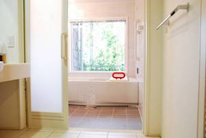 バスルーム内にバスチェア、浴槽にはバスボード・滑り止めマットを設置。
