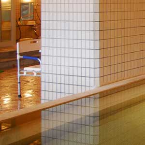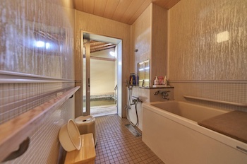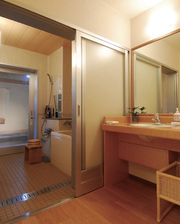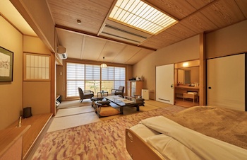 ○障害者対応客室:末広亭1階に1室(和室+簡易ベッド1台・バス・トイレ付き、広さ:12.5畳(52.5㎡))あり。客室の露天風呂は岩風呂とバリアフリーの2種類。洗面所・浴室の出入口はすべて引き戸で段差がありません。バリアフリールーム内浴室は車椅子で洗い場・浴槽まで近づけ、浴槽にはバスボードがあり、洗い場と浴槽は近く、後ろの壁には長い手摺があります。車椅子使用者でも少し介助があれば湯船に入れます。床は畳とカーペットのリバーシブルになっており、車いすでお入りいただき、ベッドでお休みいただくことができます。