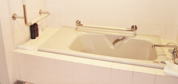 浴室はシャワーチェア、浴槽脇に腰掛けスペース、手すりあり。
