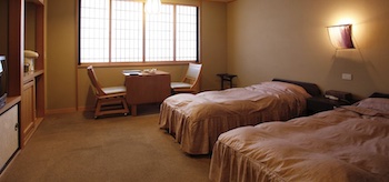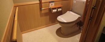 ○障害者対応客室:バリアフリー檜内風呂付ツインルーム(38㎡・2室・定員2名)は2部屋が2階にあり。ベッドは2つ。トイレと浴室はセパレートタイプ。浴室は洗い場にシャワーチェアがあり、車椅子で手摺と腰掛けスペースがある浴槽まで近づける。浴室は狭いのが難点。トイレは車椅子で手摺がある便器まで近づけるが、車椅子で入るとドアを閉めることができません。