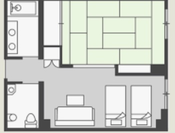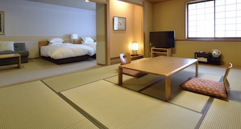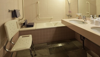 ○障害者対応客室:バリアフリー10畳+2ベット和洋室(61㎡・1室・定員8名)があり。ベッドは2つ。トイレと浴室はセパレートタイプ。浴室は洗い場にシャワーチェアがあり、車椅子で手摺と腰掛けスペースがある浴槽まで近づける。トイレは車椅子で手摺がある便器まで近づける。