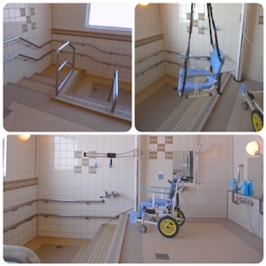 ○家族風呂:車椅子に乗ったまま、分離型入浴用車椅子の座面をリフトで吊り、湯船に浸かれる