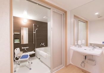 浴室に背もたれ付きシャワーチェア・手すり・浴槽脇に腰掛けスペース(要確認)があり。