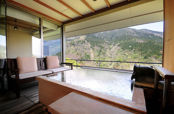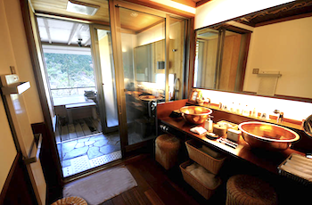 ベッドルームから、オープンテラスの客室露天風呂への導線は、リゾート気分を盛り上げてくれる。湯舟に備わるサイドテーブルで、湯浴みしながらの冷たいシャンパンをいただくのは最高の贅沢。