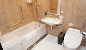 ○障害者対応客室:ユニバーサルルーム(禁煙)を4室準備しております。ユニバーサルルームは各フロア1室ずつエレベーターから一番近い部屋でご用意しております。広さ:30平米、定員:大人2名、階数:2~5F、設置ベッド:ベッド幅100cm×2。3点ユニットバスで、シャワーチェア・浴槽脇の腰掛けスペースへ移乗し、湯船に入れます。