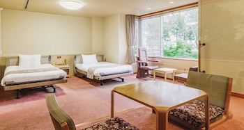 ○障害者対応客室:45㎡バリアフリー対応客室で利用人数4名です。電動ベッド2台と、天井走行リフトを備えた広々としたお部屋。 入口は引き戸タイプで、室内には手すりを配備しております。ちょっとした小上がりもあり。室内バスルームには、浴槽縁の高さとほぼ高さが同じのシャワーチェアと手摺と腰掛けスペースがあり、少し立ち上がれる方なら、湯船に入れます。