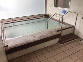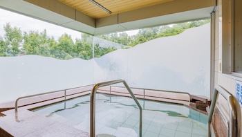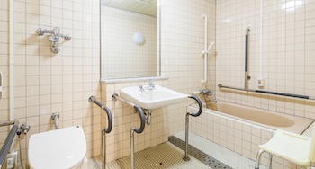 ○貸切風呂:すべてのお客様に安心してご利用いただけるお風呂です。浴槽の縁は広くほぼ全周に手摺があり、少し歩行ができる方であれば、縁に腰掛け手摺に掴まり回転して湯船に浸かれます。手摺と介助者の手助けで湯船から揚がれます。重度障害の方にはリフトもあります。