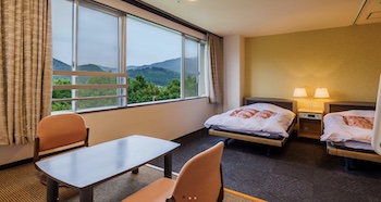 ○障害者対応客室:44㎡バリアフリー対応客室で利用人数3名です。車椅子でも楽々介護支援電動ベッド2台+小上がりのお部屋です。すべての方に安心・安全・快適にお泊りいたたけるバリアフリー対応客室です。フラットな室内に幅広スライドドア。浴室内にはシャワーチェアがあり、浴槽の縁は広く手摺があるので、少し歩行ができる方であれば、縁に腰掛け手摺に掴まり90度回転して湯船に浸かれます。重度障害の方にはリフトもあります。