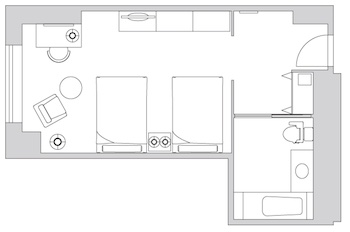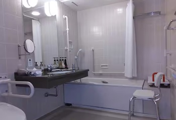○障害者対応客室:38㎡バリアフリールームで利用人数1〜2名です。ベッドサイズは200cm×120cm×高さ45cm、ベッド間隔は90cmでベッド間隔を広くとり、車椅子でもゆったりご利用いただけるツインルームタイプ。浴室内にはシャワーチェア・バスボードがあり、浴槽の縁は広く手摺があるので、少し歩行ができる方であれば、縁に腰掛け手摺に掴まり90度回転して湯船に浸かれます。入口幅120cm、ドア幅85cm。