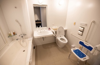 ・バリアフリールーム内のバスルームにはバスチェアもご用意しております。浴槽脇の広い縁に腰掛けて入浴。
