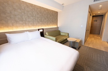 ○ユニバーサルダブル1室。広い通路空間を確保するとともに客室内の段差を排除。 バス・トイレには手すりをご用意しました。