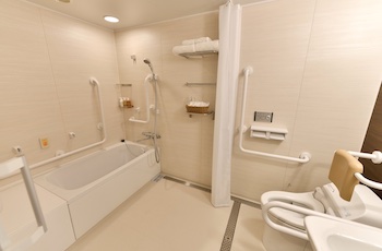 ・バリアフリールーム内のバスルームにはバスチェアもご用意しております。浴槽脇の広い縁に腰掛けて入浴。