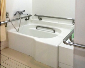 風呂は手すりを使い、広い浴槽縁に座って入浴できます。