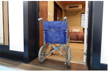○介助者なしでの館内車椅子移動可能。総合フロント(3階)や売店、お食事処は木楽館3階からほぼ段差なくご移動いただけます。3階から5階までは、車椅子でもご不便のないエレベーター(入口90cm、横幅160cm×奥行き138cm)をご利用いただけます。