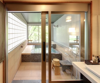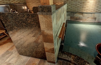 ○貸切風呂:身体の不自由な方でも安心してご利用いただけるようバリアフリーに対応しております。光包の湯と岩燕の湯がありますが、腰掛けスペースは光包の湯が広い。洗い場近くまでフラットで車椅子で入れます。シャワーチェアの貸出あり。洗い場から湯船の入り口まで2m弱手摺がありませんが、介助またはシャワーチェアを上手く使えば問題ない。