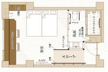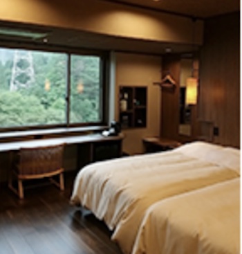 ○バリアフリー対応客室:401/402号室は30m²・定員2名のバリアフリーツイン洋室(渓谷側)、4階全4室。入口は開戸開口80cm・段差は簡易スロープで対応。トイレ・シャワーブースに⼿摺り有り。バスタブはありません。ベット:シモンズ(W1200×L2000×H525㎜)