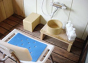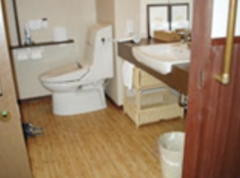 ○障害者対応客室:風呂付き車椅子対応洋室(201号室さくら301号室りきゅう)で利用人数2名です。車椅子の方も安心して利用いただけるようにバリアフリー対応の部屋を2部屋。 入口は開き戸タイプ。車椅子の座面の高さにあげてあるスペースに布団が敷いてあります。洗面台は車椅子が入る高さに設置されています。浴槽の両サイドに腰をかけるスペースがあり、浴槽の高さは約45cm、少し立ち上がれる方なら、湯船に入れます。カランの高さもシャワーチェアに合わせて高くしています。