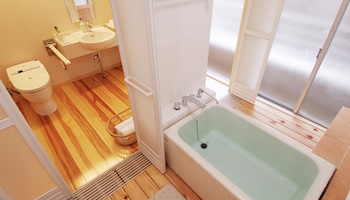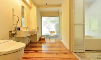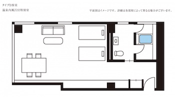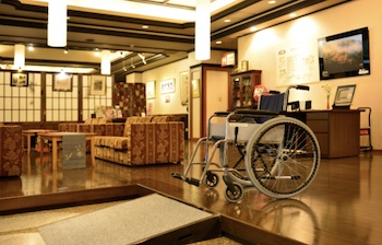 ○障害者対応客室:約58㎡(3階)源泉かけ流し 温泉内風呂付特別室で利用人数2名です。バリアフリーに対応した洋室です。広い室内なので、エキストラベッドを置いても十分お過ごしやすくなっており、3名様でのご旅行に人気です。車椅子の利用客がいる場合は、2名の定員をおすすめしております。車椅子のまま入浴はできません。手すりは設置できますが、自力で浴槽をまたげる方を対象としております。しかし、管理人は、浴槽の壁側の細長いスペースに腰掛けて、足を上げれば、湯船に入れると考えています。トイレには手すり(両サイド)を設置しております。