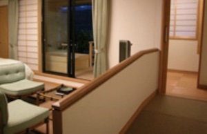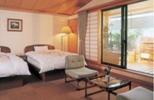 ○バリアフリールーム:ユニバーサルデザインツイン洋室2室(定員2名)とユニバーサルデザイン源泉温泉露天風呂付き和室+バリアフリーツイン洋室1室(定員4名)。ツイン洋室はお部屋入口は車いす対応のスロープで安心、車いすのままで浴槽の近くまで手すりもあって安全、水平スライド式のドアで開閉もラクラク。バリアフリー洋室+源泉温泉露天風呂付き和室は開放感のある広々としたつくりは車いすでもゆったり、洋室から露天風呂まで続くなだらかなスロープがあります。