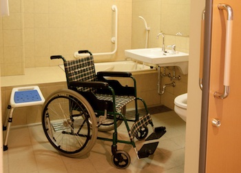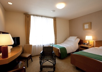 ○障害者対応客室:22〜25㎡(2室)ユニバーサルデザインルーム(身体障害者対応客室)で利用人数2名です。幅広の出入口、低めに取付けられたドアノブ、車椅子対応トイレ&バスルームなど車椅子に配慮した部屋。ベット幅100cmで電動ベッドを使用。浴室にはシャワーチェア、浴槽縁に腰掛けスペースがあります。1室内に浴槽・洗面台・トイレがあります。