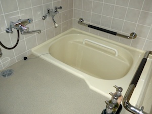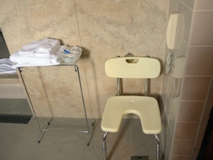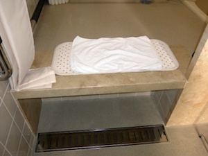 シャワーチェアがあり、浴槽の縁と同じ高さの床があります。