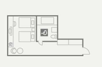 ○障害者対応客室:33.0㎡・定員2〜3名のバリアフリールーム1室あり。シングルルベッドが2台・エクストラベッドが1台あり。洗面・トイレ・浴室が1ブースの中にあり、車いすで移動しやすい。トイレは左にL字手すりがあり。浴室はシャワーチェアがあり、浴槽脇腰掛けスペースがあり。