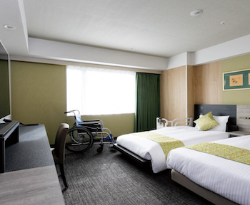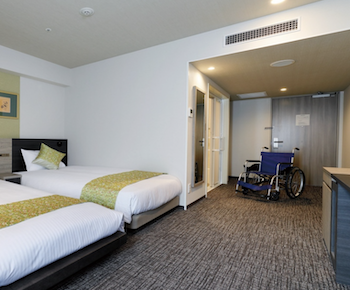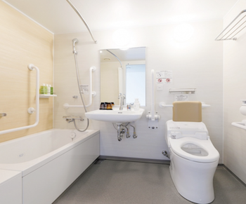 ○障害者対応客室:26.41㎡ユニバーサルツインルームで利用人数2名です。ベッドが2台(110㎝×195㎝×46㎝、91㎝×190㎝×56㎝(電動ベッド))入った客室です。入口はフラットになっており、ユニバーサルデザインのバストイレ(1室タイプ)になっています。ユニットバス・トイレ入口はバリアフリーの引き戸で、浴槽脇に広い腰掛けスペース、浴槽用手すりがあります。貸出備品にシャワーチェアの記載がありませんが、予約時にお願いすれば、対応をいただけます。浴槽縁を跨げない車椅子使用者でも湯船に浸かれ、浴槽内でシャワーチェアに座ってシャワーできます。