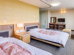 ○障害者対応客室:42㎡バリアフリー(身体障害者対応客室)で利用人数2名です。手元のリモコンで高さを調節できる「電動ベッド」をはじめ、天井に設けた走行リフトを使って、ベッドから客室内にある浴室、トイレまで移動することができます。天井走行リフトを利用の場合は、予約時にお申し付けください。浴室にはシャワーチェア、浴槽縁に腰掛けスペース、浴槽用手すり、浴槽台があります。浴槽の中でシャワーするタイプです。1室内に浴槽・洗面台・トイレがあります。トイレが開口幅60センチの引き戸になっておりバリアフリー。2センチほどの段差があるが斜めに切ってあるので室内用スリムタイプなら車椅子でもトイレに入れそう。