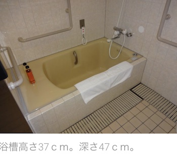 ○障害者対応客室:ツイン1室あり。出入り口の幅:85cm。バスルーム・トイレの段差はなし。バスルームには、シャワーチェアがあります。浴槽は高さ38cmX幅60cmX長さ104cmで手すりがあり、浴槽への出入りも安心です。