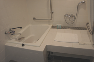 ○障害者対応客室:あり。2名利用の47m²デラックスツインルームと、4名利用の70m²(6畳含む)和洋室の各1室ずつ。デラックスツインルームはエキストラベッドを追加して、トリプルとしても利用できます。車椅子でもストレスなくご利用いただけ、バリアフリーバスルームも同室内に別にございます。車いすのまま利用できるスロープや専用バス&トイレあり、付き添いの方用バスルームもあり、ベッドサイズ:120x200cm。車椅子のままバスルームに入室出来る部屋のタイプはデラックスツインタイプ以上の部屋となります。
