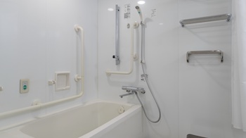 シャワーチェアがあり、バスタブは腰がかけられるほど広い。
