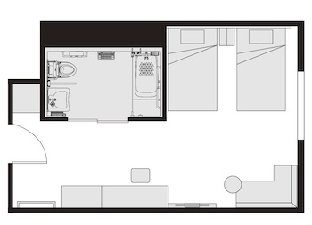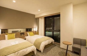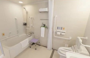 ○バリアフリールーム:34.19㎡・最大定員2名のユニバーサルツインルームがあります。ベッドサイズはW1,220mm×H2,030mmが2台です。低めのベッド、カーテンの開閉をしやすくする操作棒の他、バスルームにも使いやすさに工夫しました。浴槽には広い腰掛けスペースとシャワーチェアがあり、少し歩ける車椅子ユーザーでも湯船に入れます。