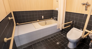 ○バリアフリールーム:38㎡・最大定員3名のバリアフリールーム(バス付)があります。すべてのお客さまに快適な空間を。手元のリモコンで高さを調節できる「電動ベッド」をはじめ、天井に設けた走行リフトを使って、ベッドから客室内にある浴室、トイレまで移動することができます。浴槽には広い腰掛けスペースがあり、少し歩ける車椅子ユーザーでも湯船に入れます。