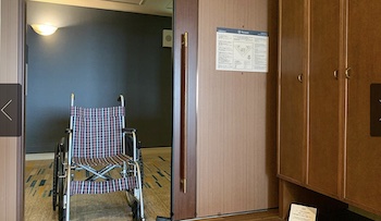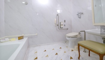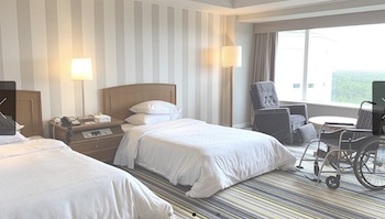 ○障害者対応客室部屋の広さ:47㎡・定員数2名のバリアフリールームが8階に2室あり。スライド式ドア、緩やかなアプローチ、フラットなフロアー、ワイドな導線、洗面所・トイレバスルームにはスロープと安心してご利用いただける設計となっております。入り口ドアタイプ:片引き戸、入り口ドア開口時の幅:90cm、トイレ入り口ドアタイプ:片引き戸、トイレ入り口ドア開口時の幅:80cm、トイレ入り口段差:なし、バスルーム入り口ドアタイプ:片引き戸、バスルーム入り口ドア開口時の幅:80cm、バスルーム入り口段差:なし、バスルーム:手摺あり・シャワーチェアあり・浴槽縁に広い腰掛けスペースあり。